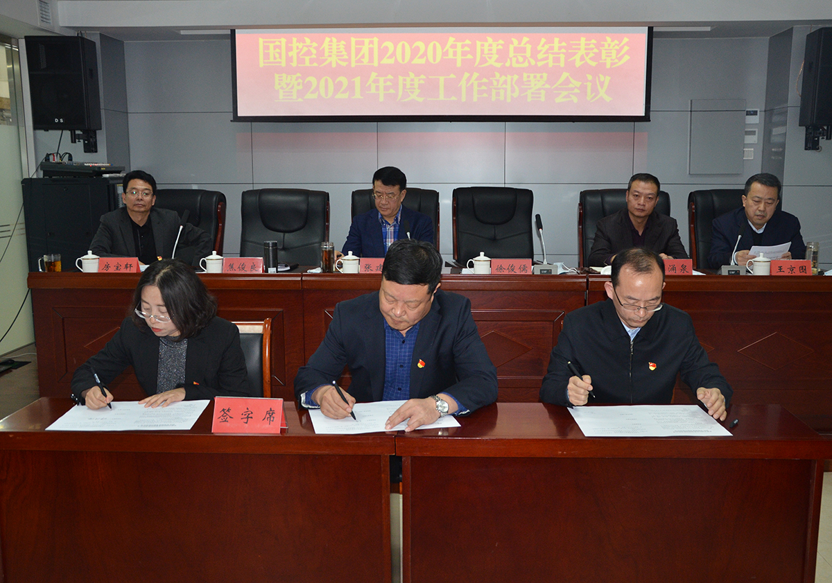 會議宣讀了集團公司2020年度受表彰情況,就獲得優(yōu)秀的部室和員工進行了通報,并頒發(fā)了榮譽證書。按照2021年度工作部署要求,黨委副書記、總經(jīng)理徐俊儒代表集團公司逐一與各部室及子公司簽訂《2021年度績效考核目標責任書》,層層壓實責任,立下“軍令狀”。