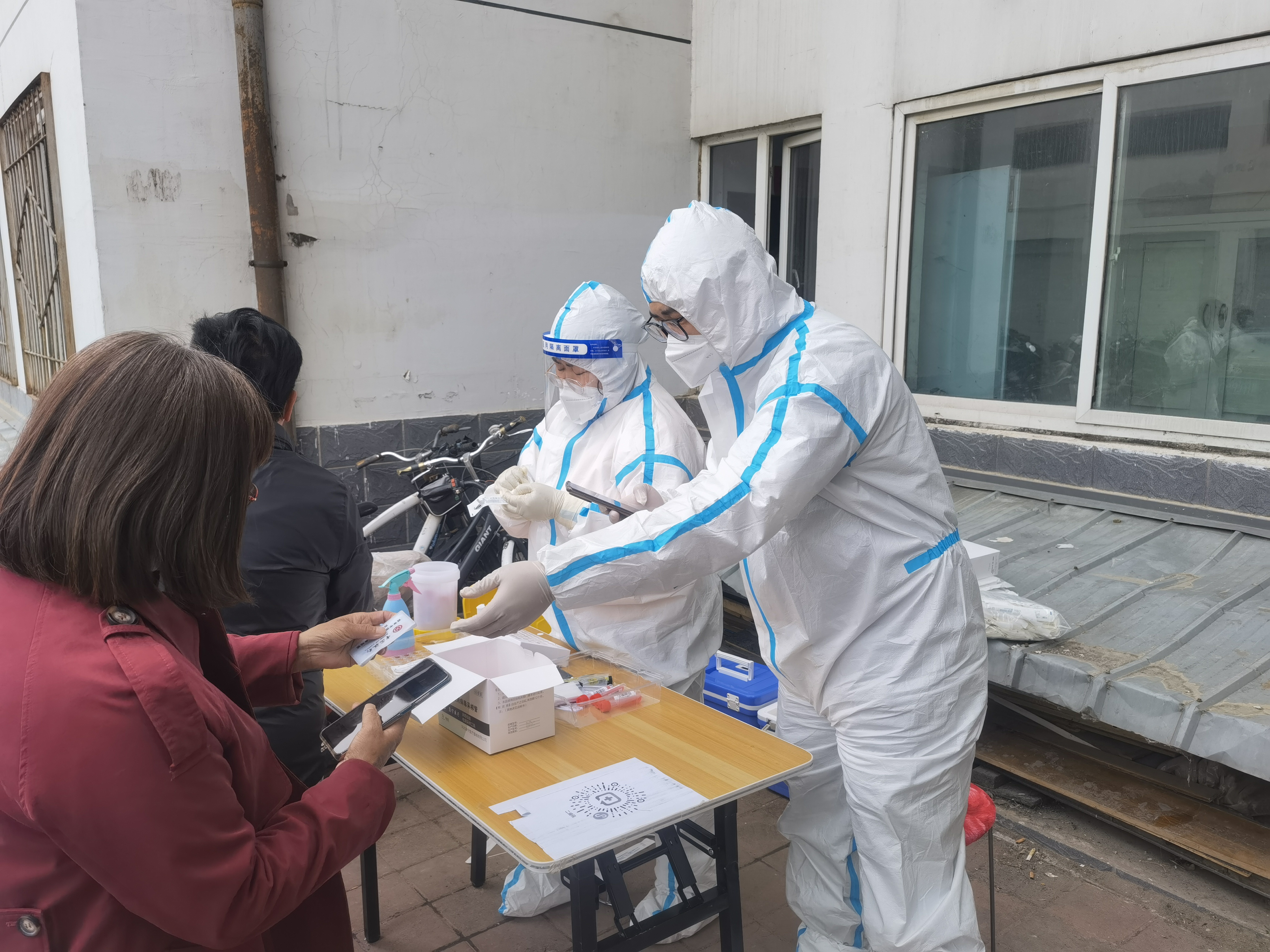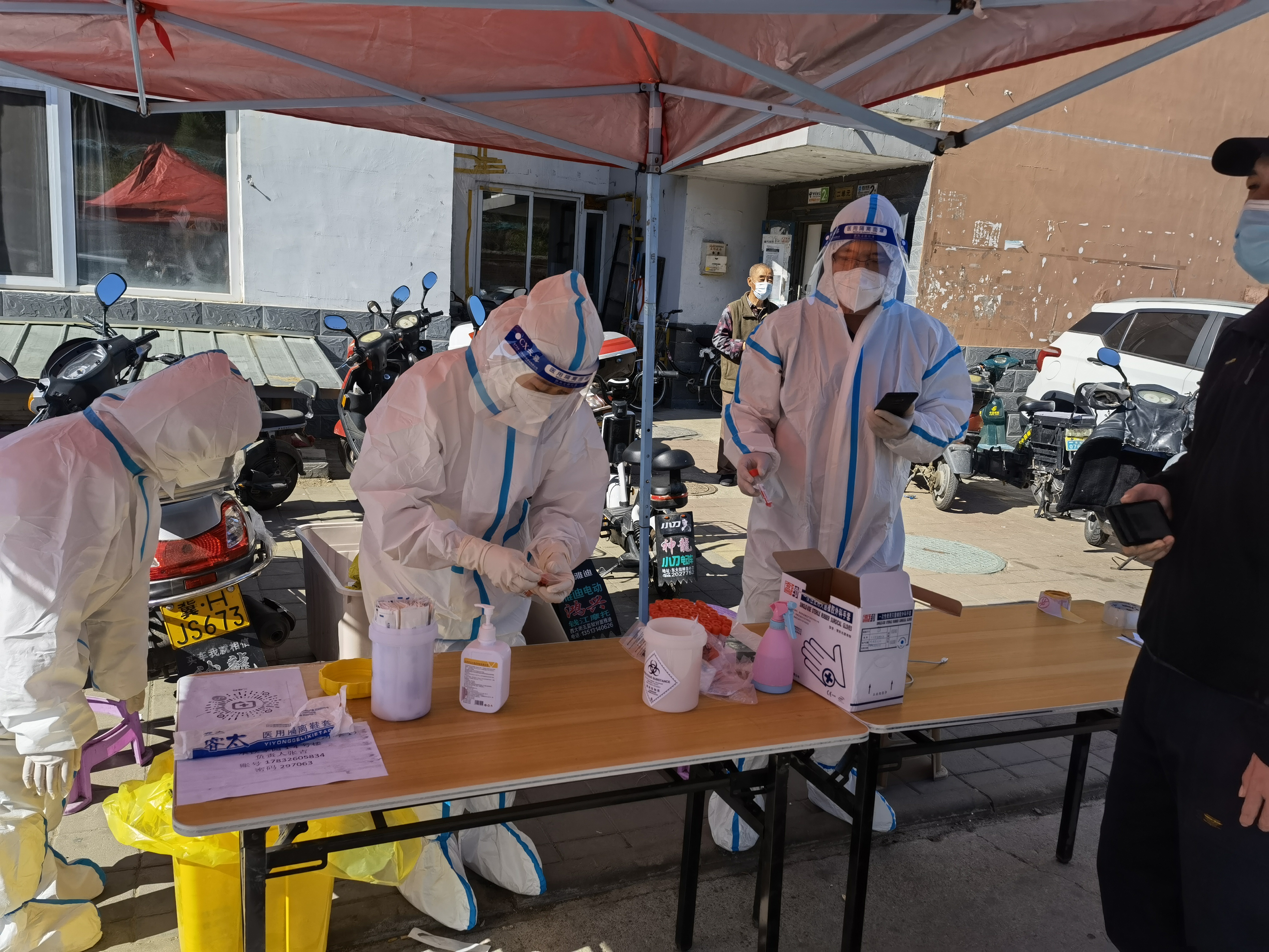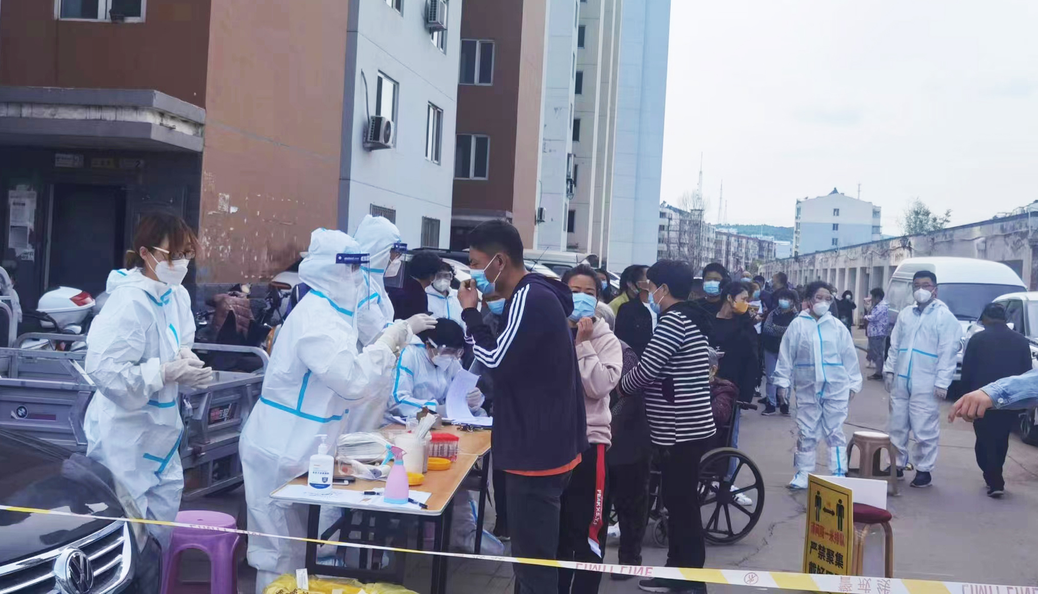 “穿上防護(hù)服成為‘大白’,感到非常光榮,也感到責(zé)任重大?!苯诔械職鉁厣?,集團(tuán)公司許平凡、紀(jì)哲負(fù)責(zé)維護(hù)秩序、信息錄入,每天穿著密不透風(fēng)的防護(hù)服、戴著醫(yī)用口罩及手套,里面衣服被汗水浸透,手被捂得發(fā)白,鼻梁被口罩壓出瘀痕,平時(shí)顯得厚實(shí)的腳套,每天都被磨破兩三雙,一刻不停的指揮居民排隊(duì),逐樓的通知居民下樓核酸,嗓子都喊啞了,也從沒有喊過累。