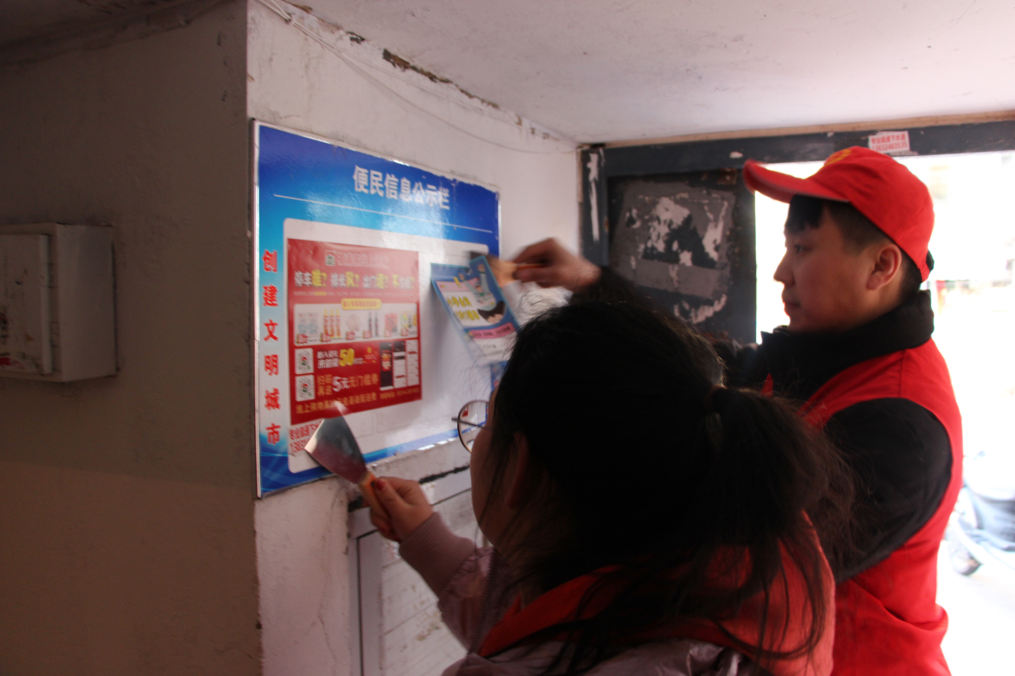 會后,集團公司與會龍山社區(qū)積極對接,安排人員分批次深入會龍山社區(qū),與社區(qū)書記現(xiàn)場溝通并安排部署幫建工作。志愿者們向社區(qū)居民發(fā)放黨的二十大精神宣傳手冊、對轄區(qū)內(nèi)消防設施進行清潔檢查、單元樓內(nèi)外非法廣告進行清除、對非機動車進行合理擺放、樓內(nèi)外堆放垃圾雜物上門進行溝通,向居民講解雜物堆積的潛在危害,進一步提升了社區(qū)居民的文明意識。