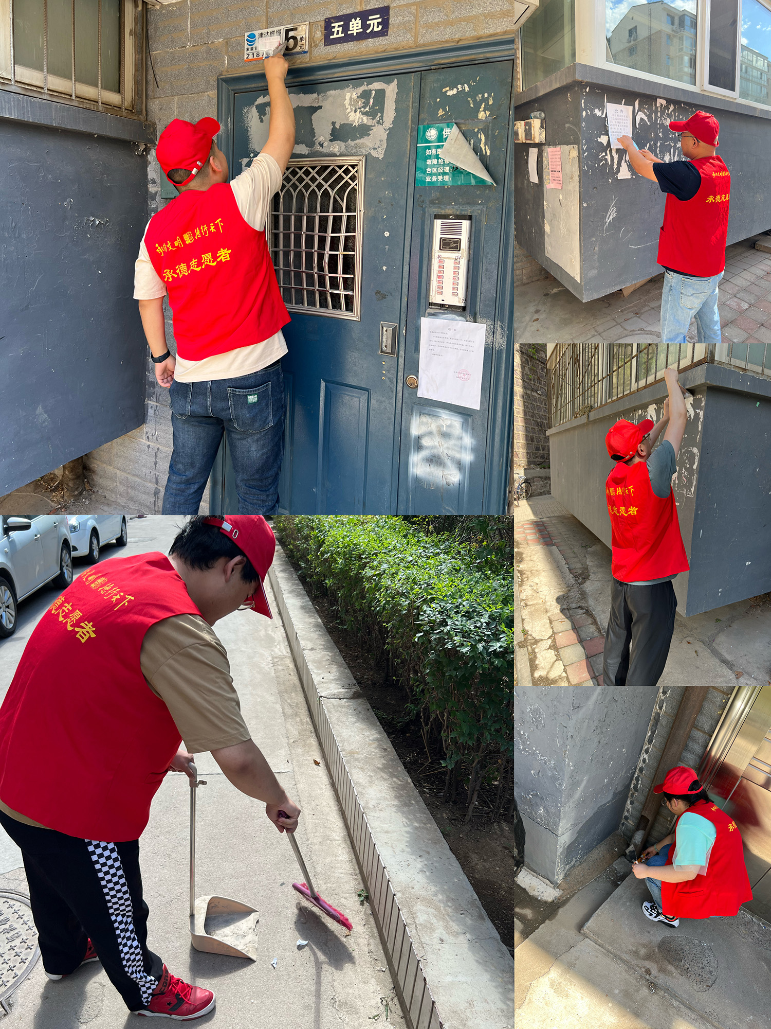 在活動現(xiàn)場,大家身穿紅色志愿者馬甲,手持鏟子、掃帚、簸箕等工具,在炎炎夏日中為小區(qū)居民打掃小區(qū)衛(wèi)生,著重清除非法小廣告以及衛(wèi)生死角、亂點。